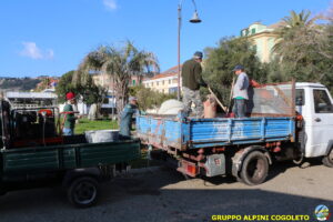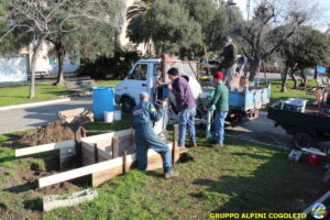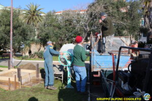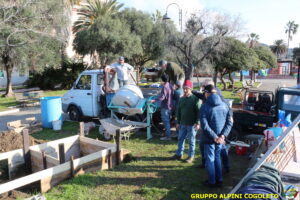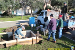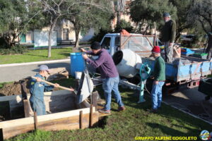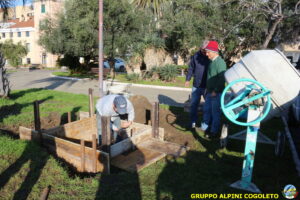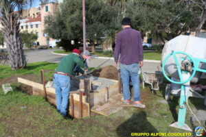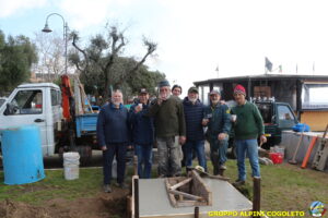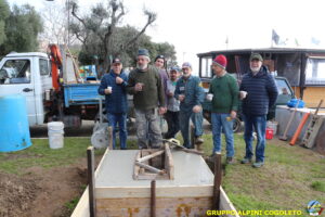 Il lavoro prosegue spedito e senza intoppi posizioniamo nella platea anche la predisposizione per l’asta della bandiera. Al centro della gettata sistemiamo una cassetta di legno opportunamente dimensionata. Sarà l’alloggiamento dove metteremo la pietra che costituisce il cuore del monumento. Alle 11.30 il lavoro è praticamente terminato, si mette via tutto il materiale avanzato e l’attrezzatura. Ma c’è tempo per un brindisi finale e per qualche foto ricordo, da pubblicare sui social o ancor meglio da tramandare a chi verrà dopo di noi. Finiamo ringraziando Giampiero che è sempre disponibile quando abbiamo bisogno, i suoi ragazzi e gli alpini del gruppo che hanno dato una mano, sia pratica che morale.