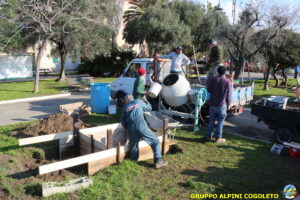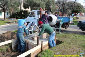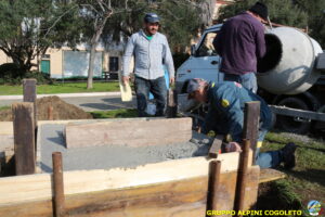 Oggi, 14 febbraio, è stata costruita la base del monumento, un modo per festeggiare San Valentino in maniera molto alternativa. Stamattina infatti appuntamento sul presto, presso lo scavo, per armare e gettare la base in calcestruzzo del monumento. Il socio aggregato Giampiero Calcagno (militare assolto nelle fila della specialità Bersaglieri) che è del mestiere, si è reso disponibile per effettuare il lavoro. Dopo aver caricato il necessario ieri sera, di buon ora è già al lavoro. Con lui i suoi operai Danilo e Paolo, coadiuvati da i nostri due Rossi (Gianni e Nicolino). In men che non si dica costruiscono cassaforma per la gettata, e dopo uno spuntino a base di focaccia si comincia ad impastare.