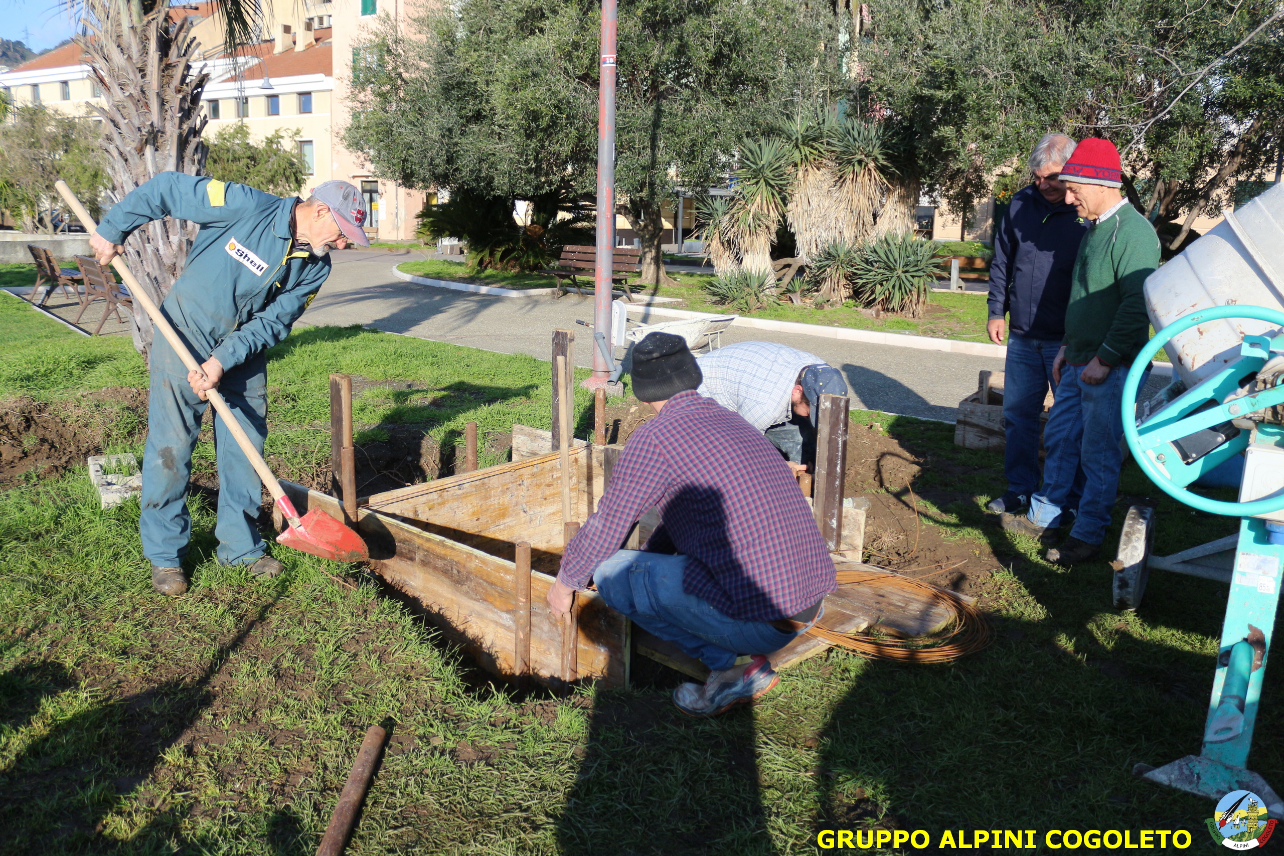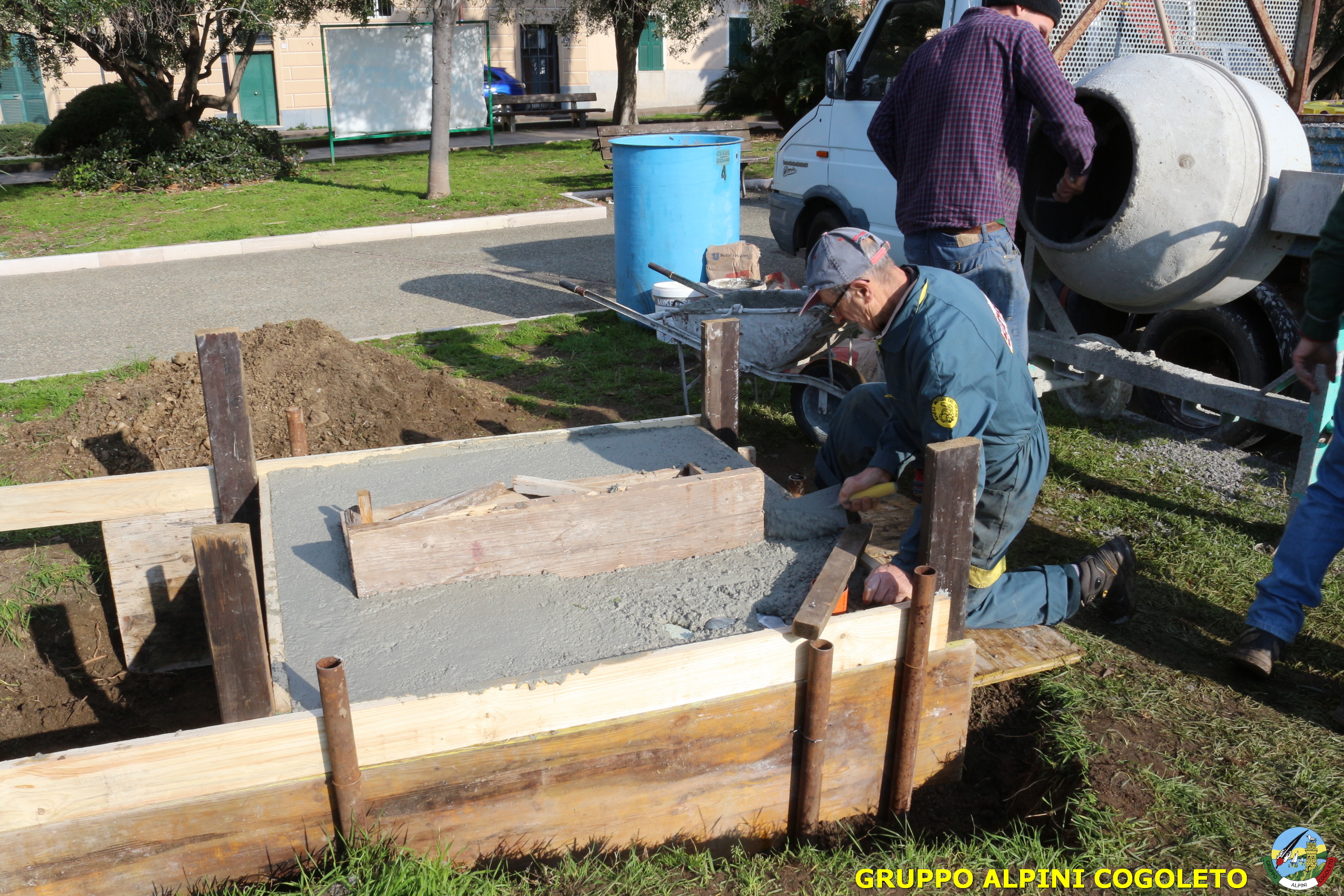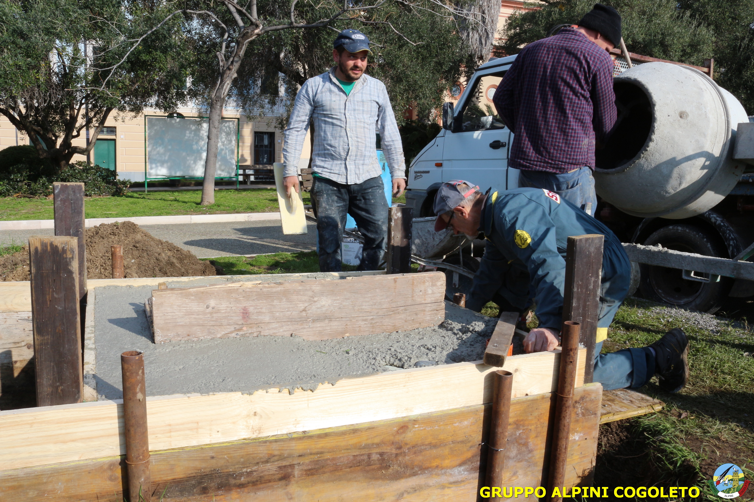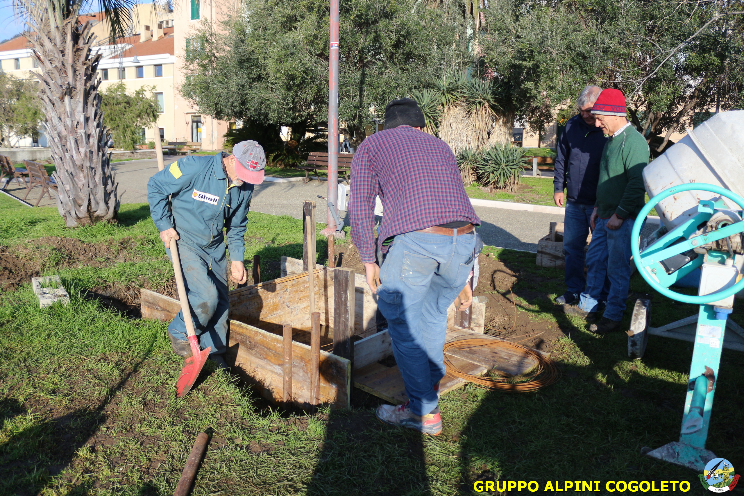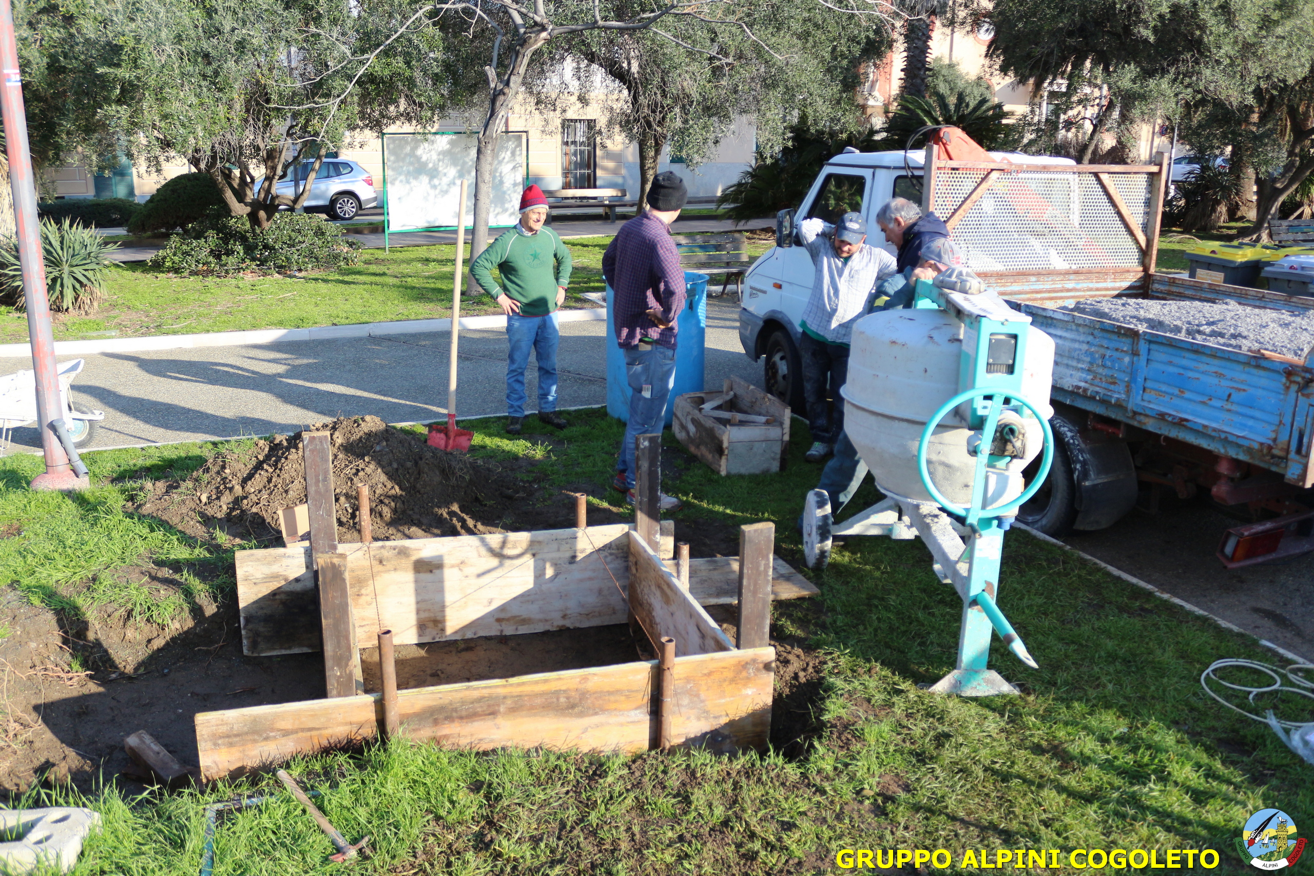 Oggi, 14 febbraio, è stata costruita la base del monumento, un modo per festeggiare San Valentino in maniera molto alternativa. Stamattina infatti appuntamento sul presto, presso lo scavo, per armare e gettare la base in calcestruzzo del monumento. Il socio aggregato Giampiero Calcagno (militare assolto nelle fila della specialità Bersaglieri) che è del mestiere, si è reso disponibile per effettuare il lavoro. Dopo aver caricato il necessario ieri sera, di buon ora è già al lavoro. Con lui i suoi operai Danilo e Paolo, coadiuvati da i nostri due Rossi (Gianni e Nicolino). In men che non si dica costruiscono cassaforma per la gettata, e dopo uno spuntino a base di focaccia si comincia ad impastare.
