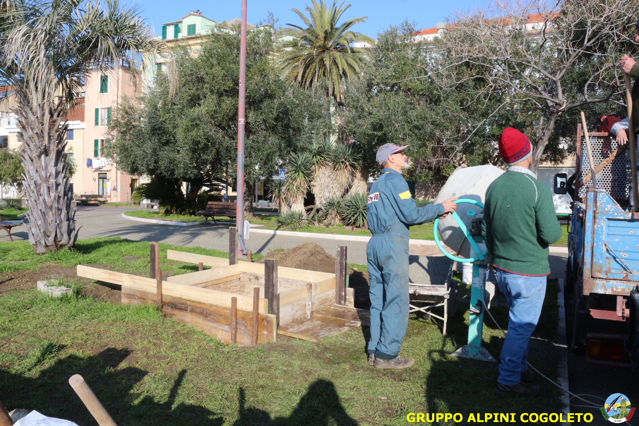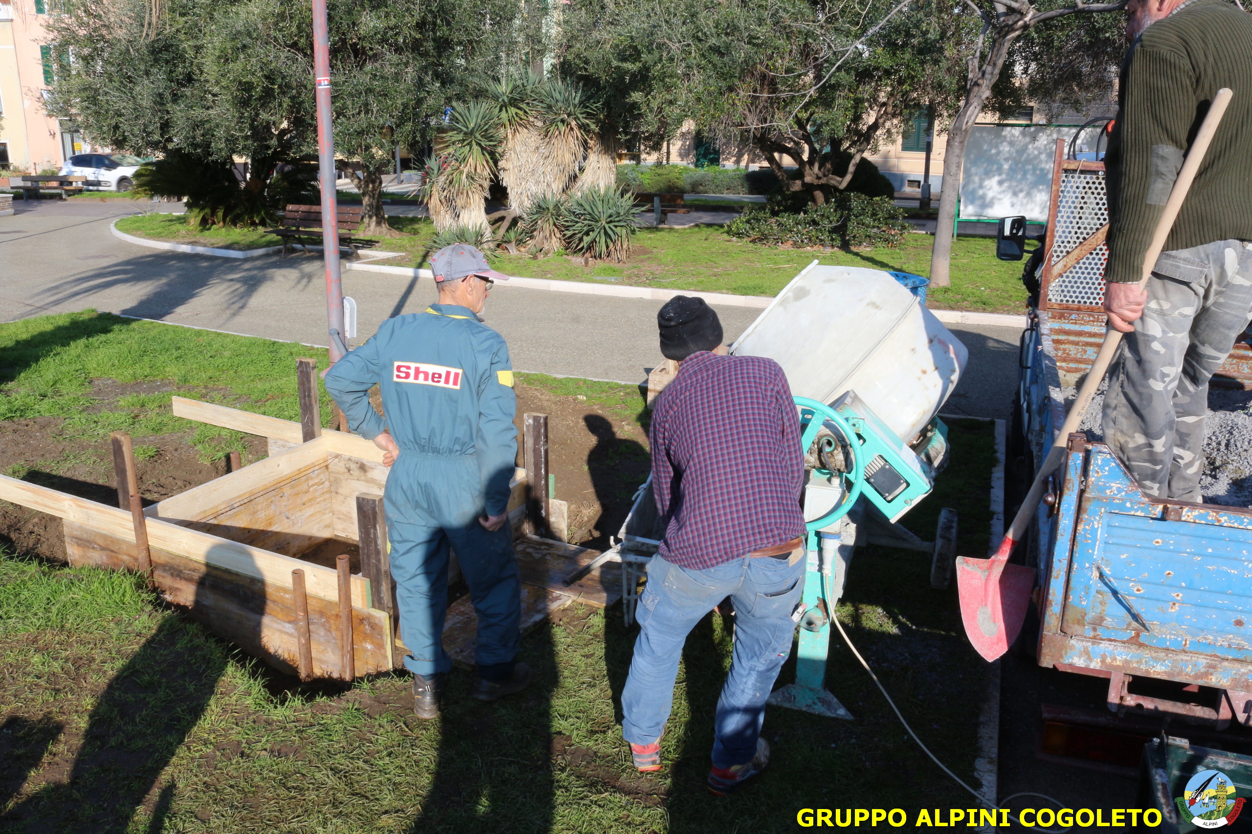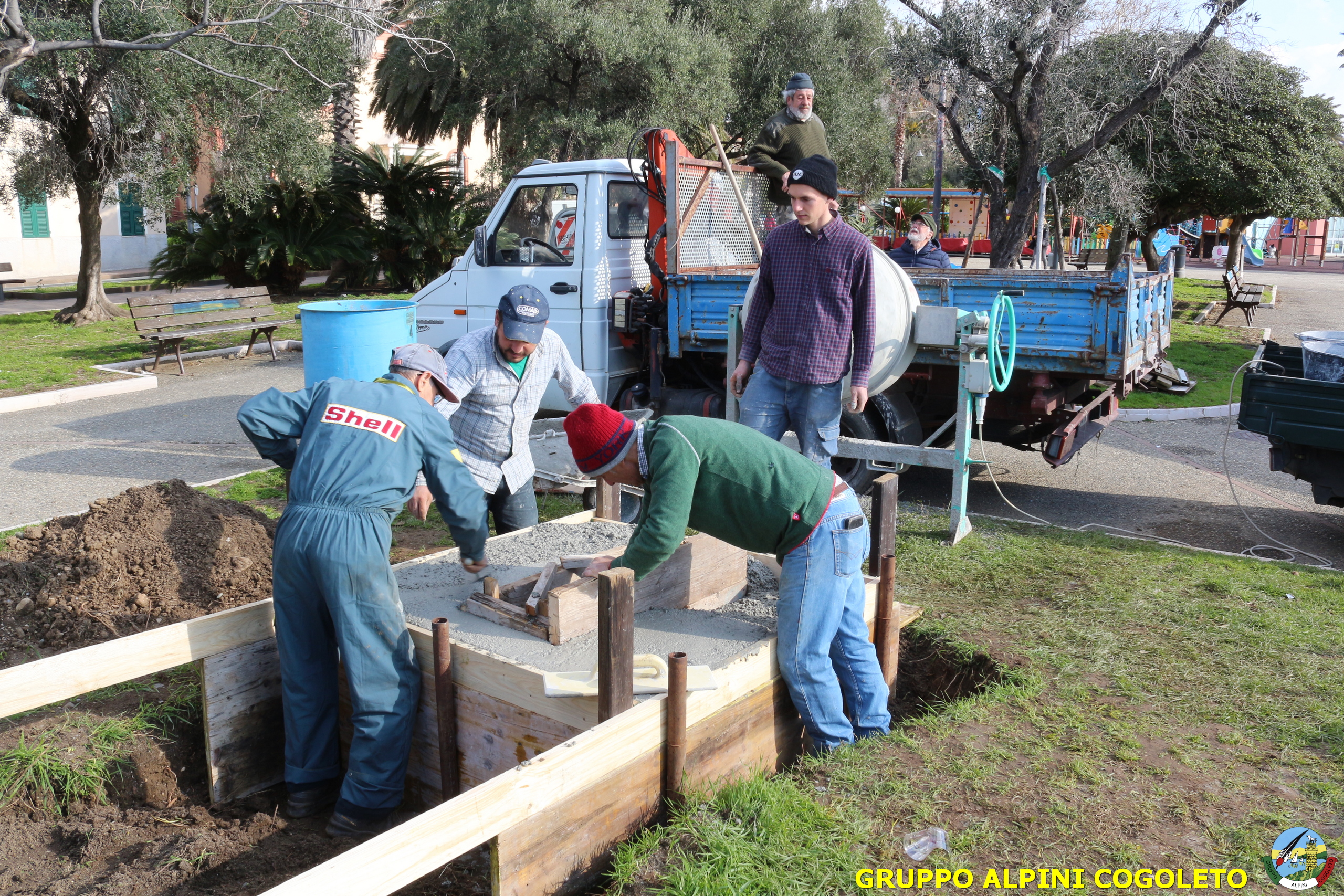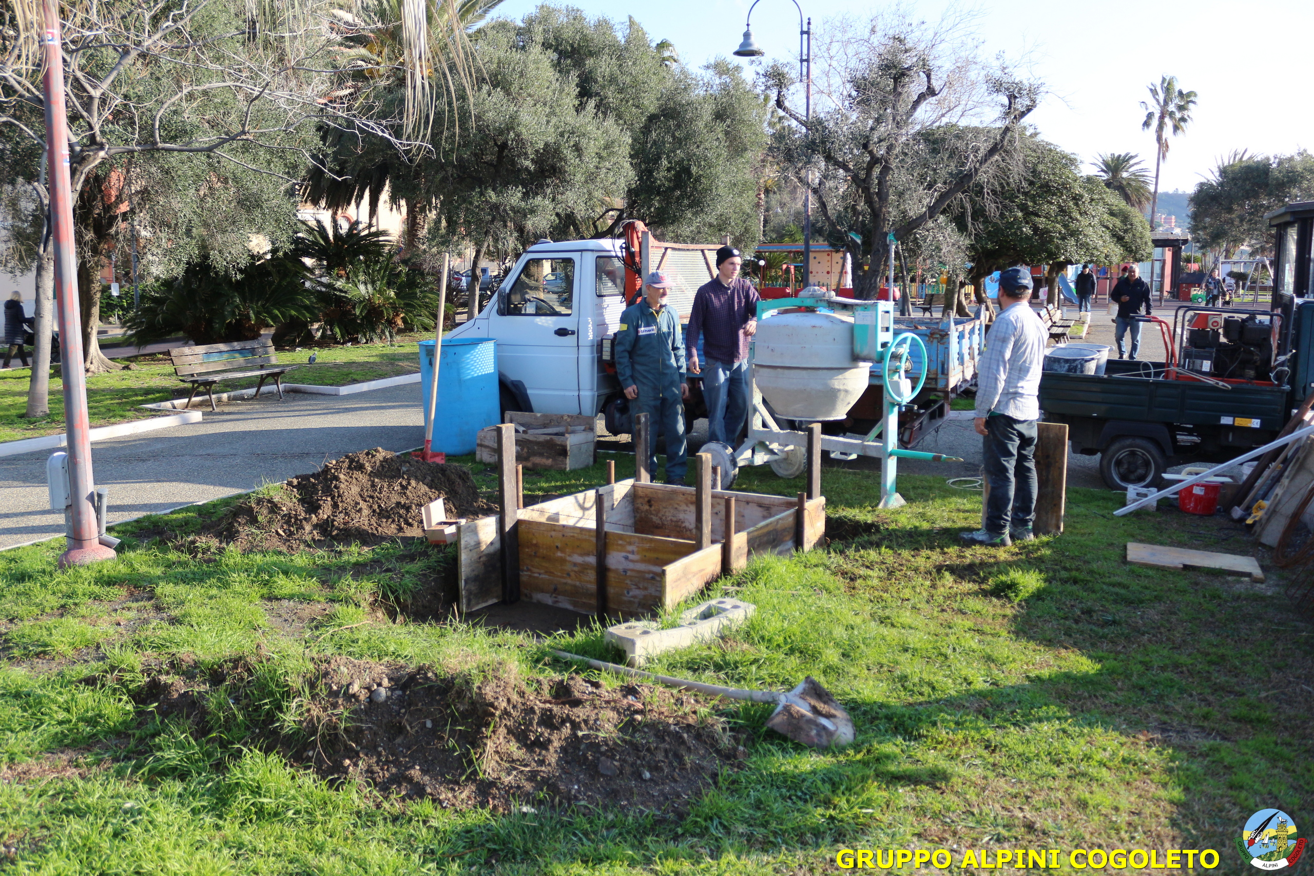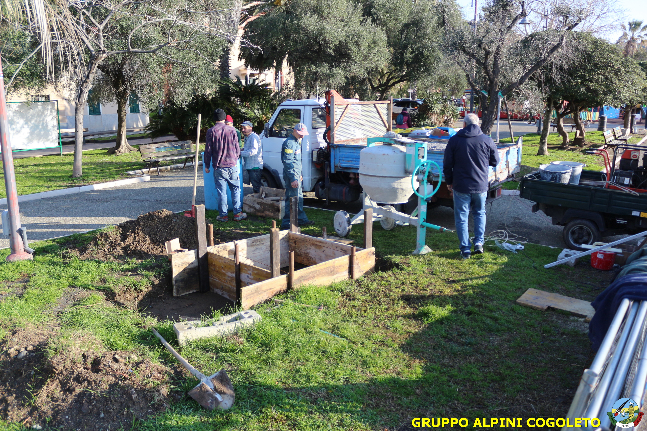 Oggi, 14 febbraio, è stata costruita la base del monumento, un modo per festeggiare San Valentino in maniera molto alternativa. Stamattina infatti appuntamento sul presto, presso lo scavo, per armare e gettare la base in calcestruzzo del monumento. Il socio aggregato Giampiero Calcagno (militare assolto nelle fila della specialità Bersaglieri) che è del mestiere, si è reso disponibile per effettuare il lavoro. Dopo aver caricato il necessario ieri sera, di buon ora è già al lavoro. Con lui i suoi operai Danilo e Paolo, coadiuvati da i nostri due Rossi (Gianni e Nicolino). In men che non si dica costruiscono cassaforma per la gettata, e dopo uno spuntino a base di focaccia si comincia ad impastare.