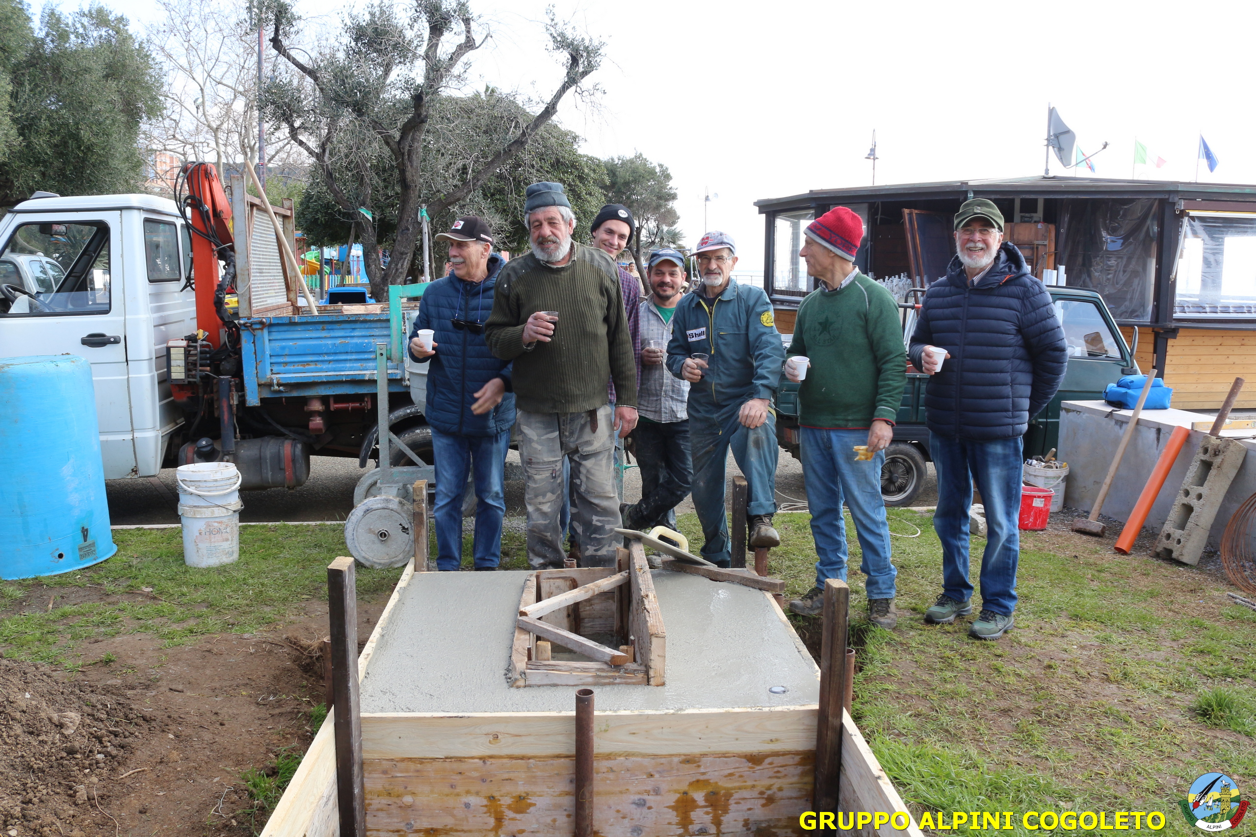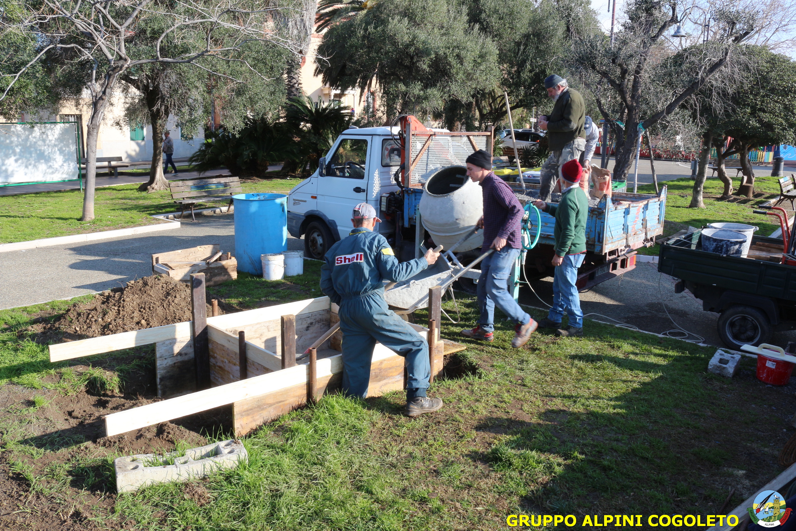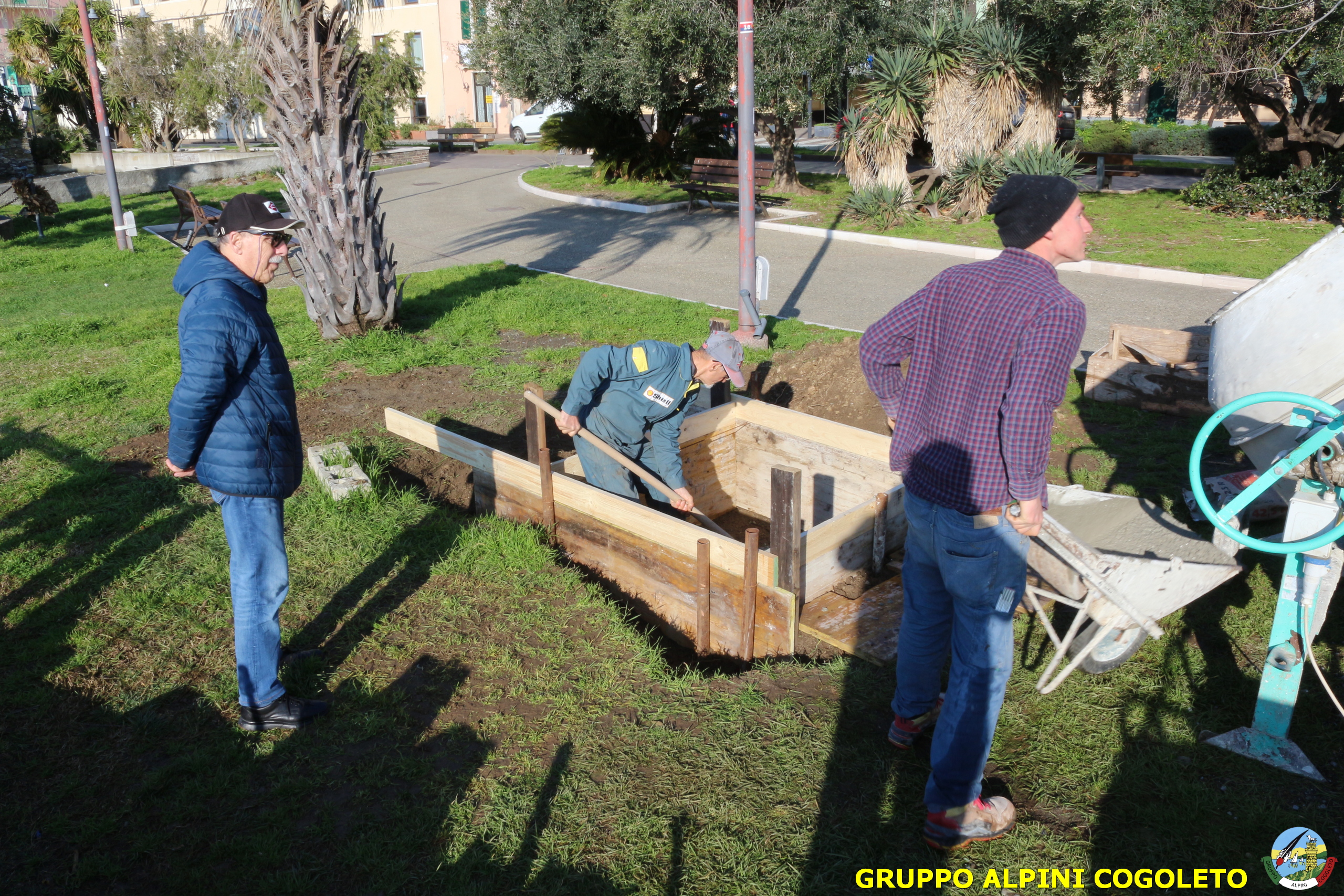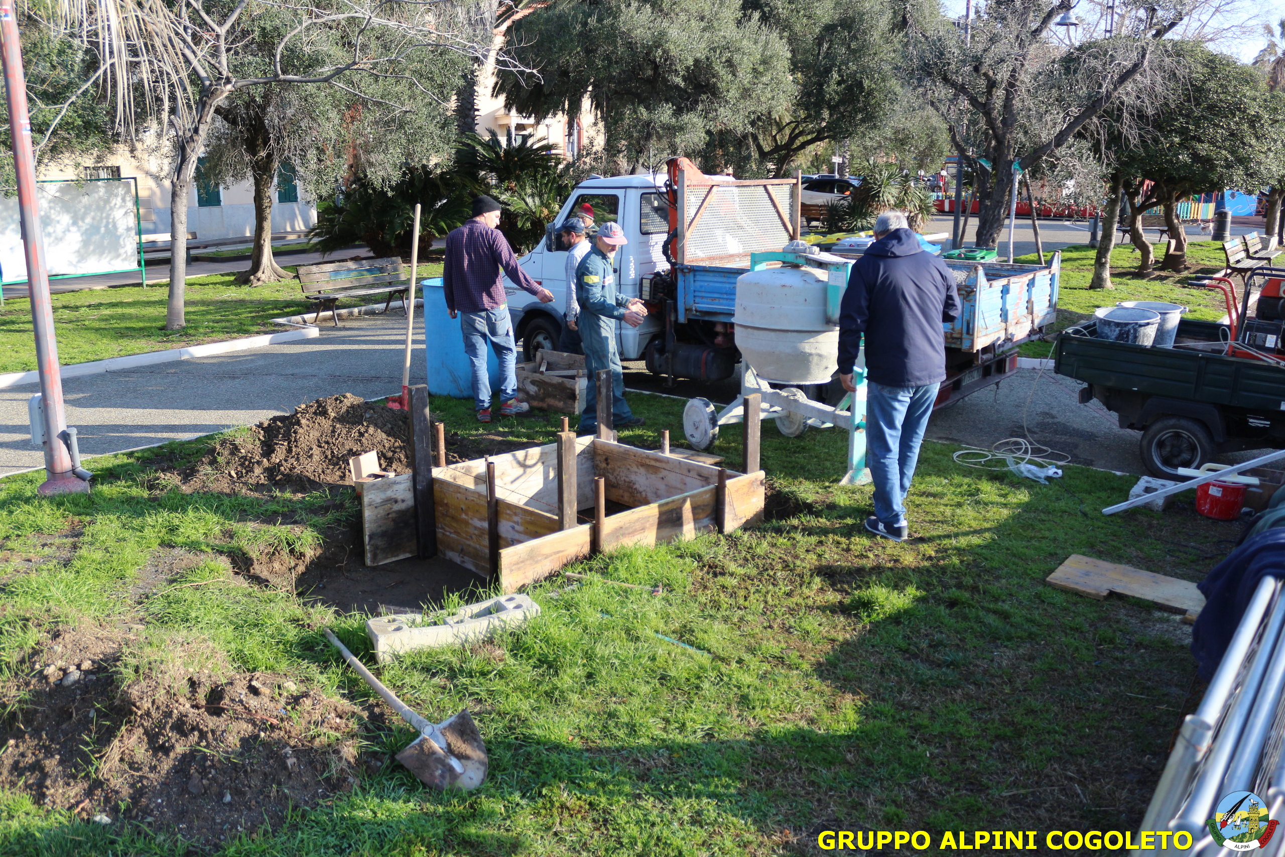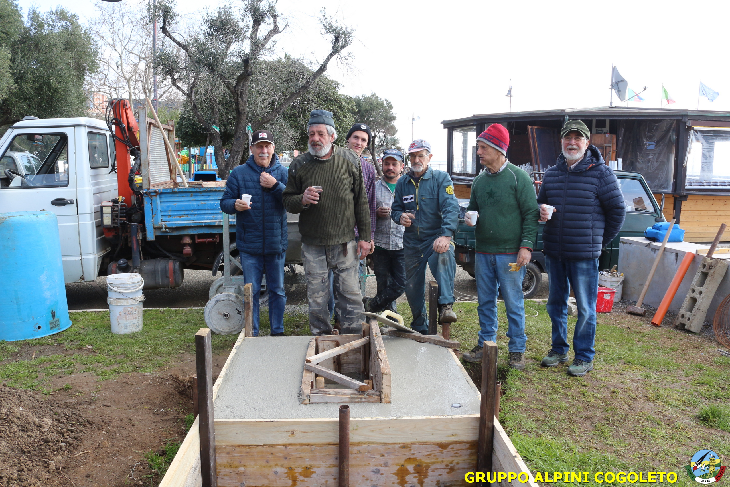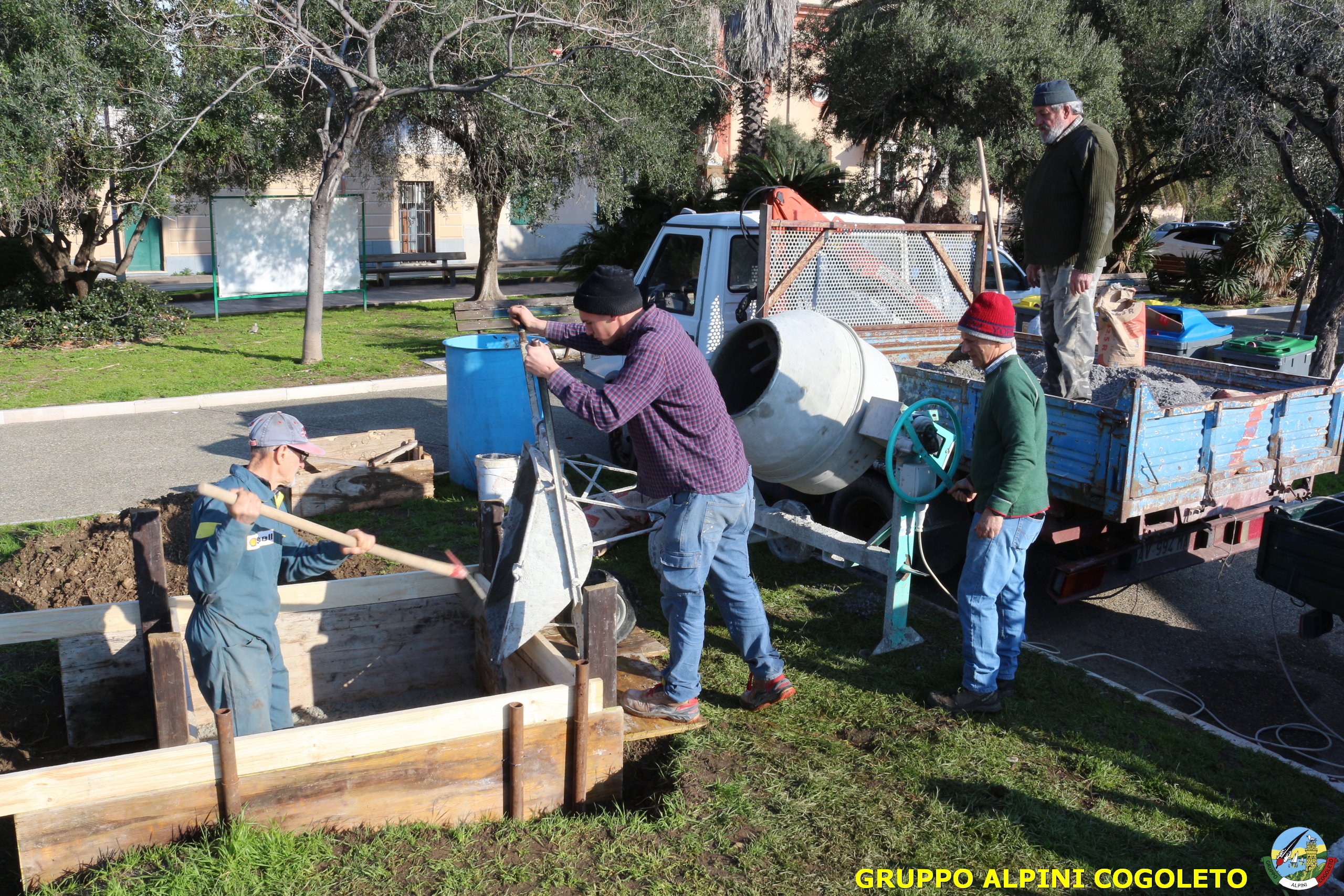 Oggi, 14 febbraio, è stata costruita la base del monumento, un modo per festeggiare San Valentino in maniera molto alternativa. Stamattina infatti appuntamento sul presto, presso lo scavo, per armare e gettare la base in calcestruzzo del monumento. Il socio aggregato Giampiero Calcagno (militare assolto nelle fila della specialità Bersaglieri) che è del mestiere, si è reso disponibile per effettuare il lavoro. Dopo aver caricato il necessario ieri sera, di buon ora è già al lavoro. Con lui i suoi operai Danilo e Paolo, coadiuvati da i nostri due Rossi (Gianni e Nicolino). In men che non si dica costruiscono cassaforma per la gettata, e dopo uno spuntino a base di focaccia si comincia ad impastare.