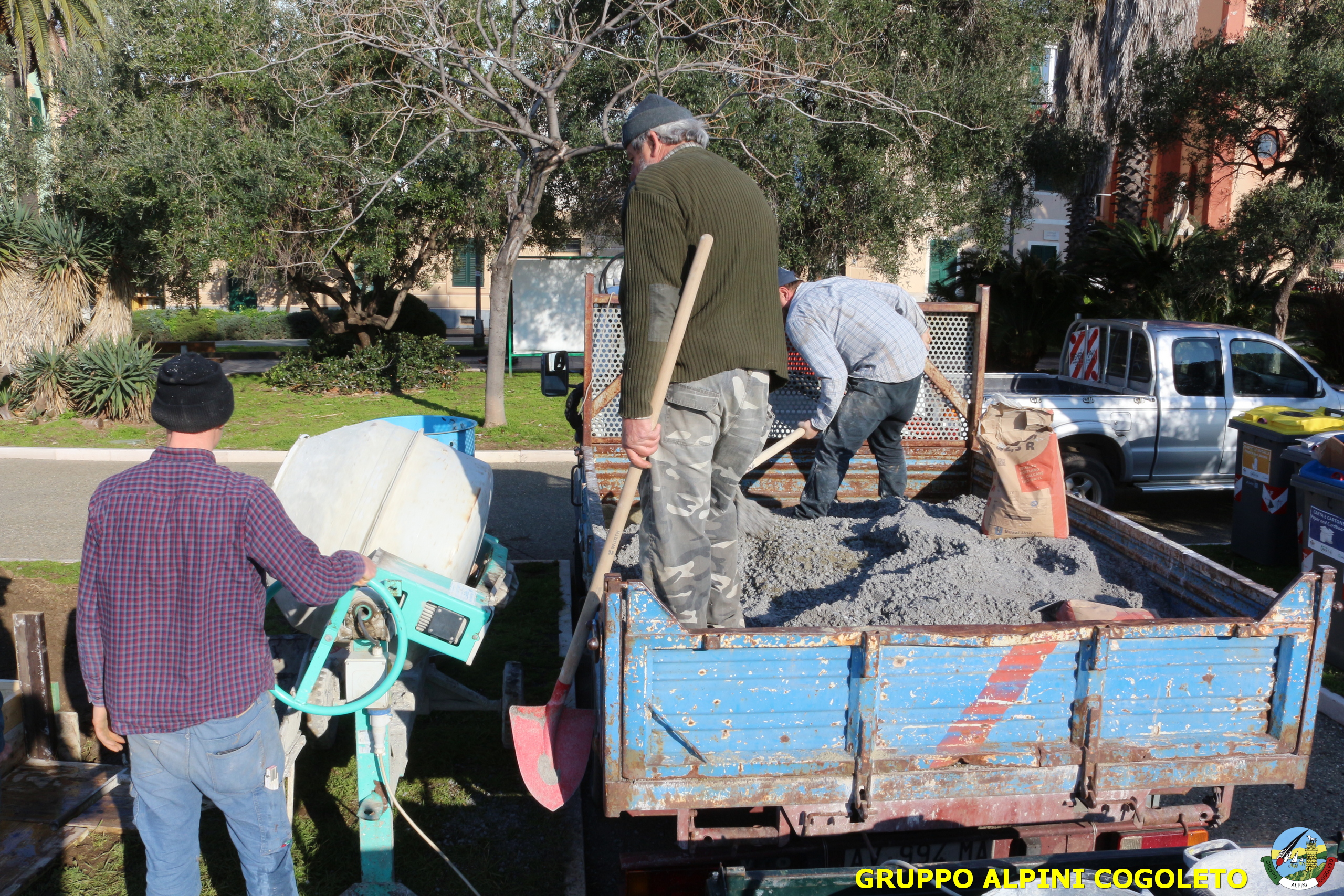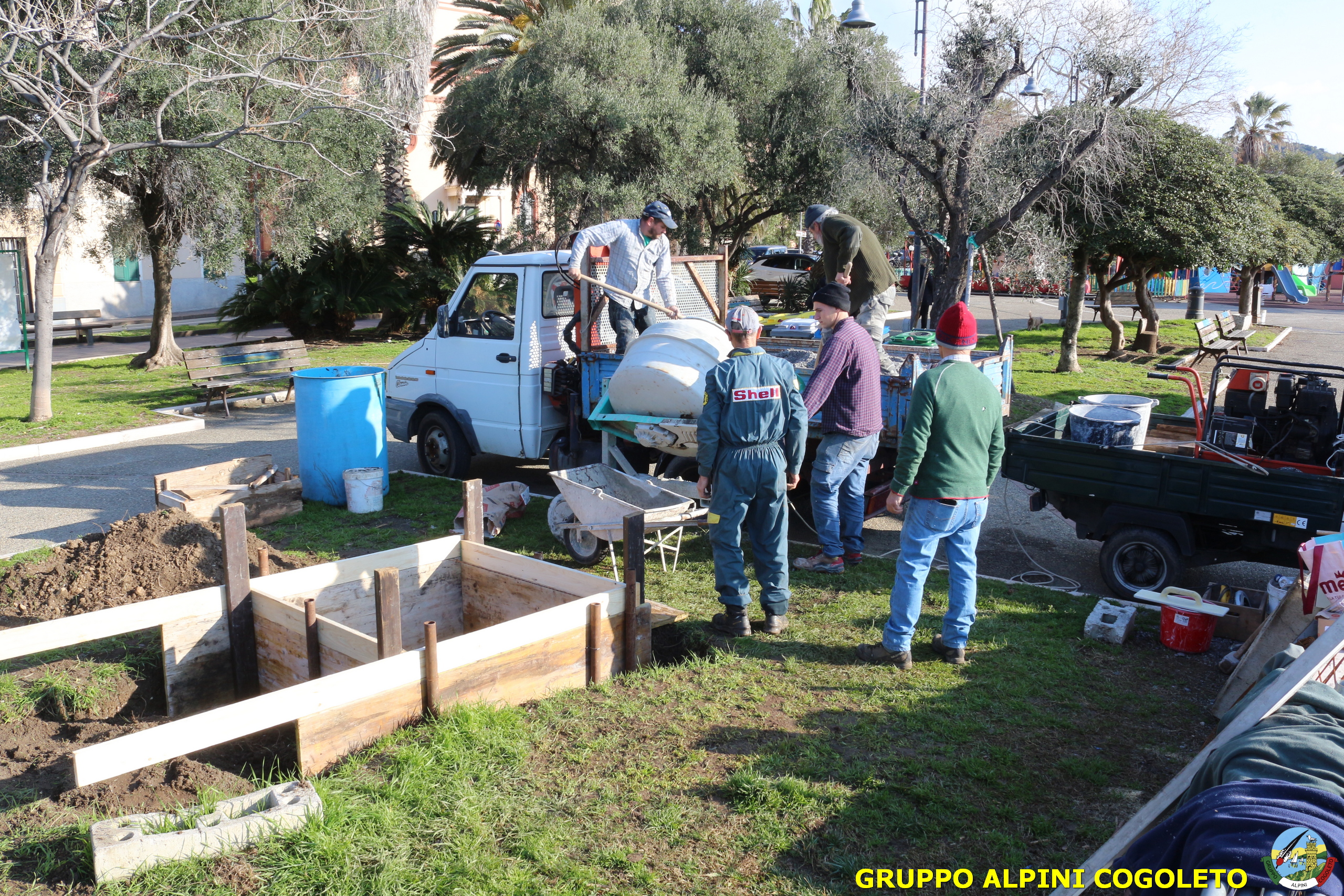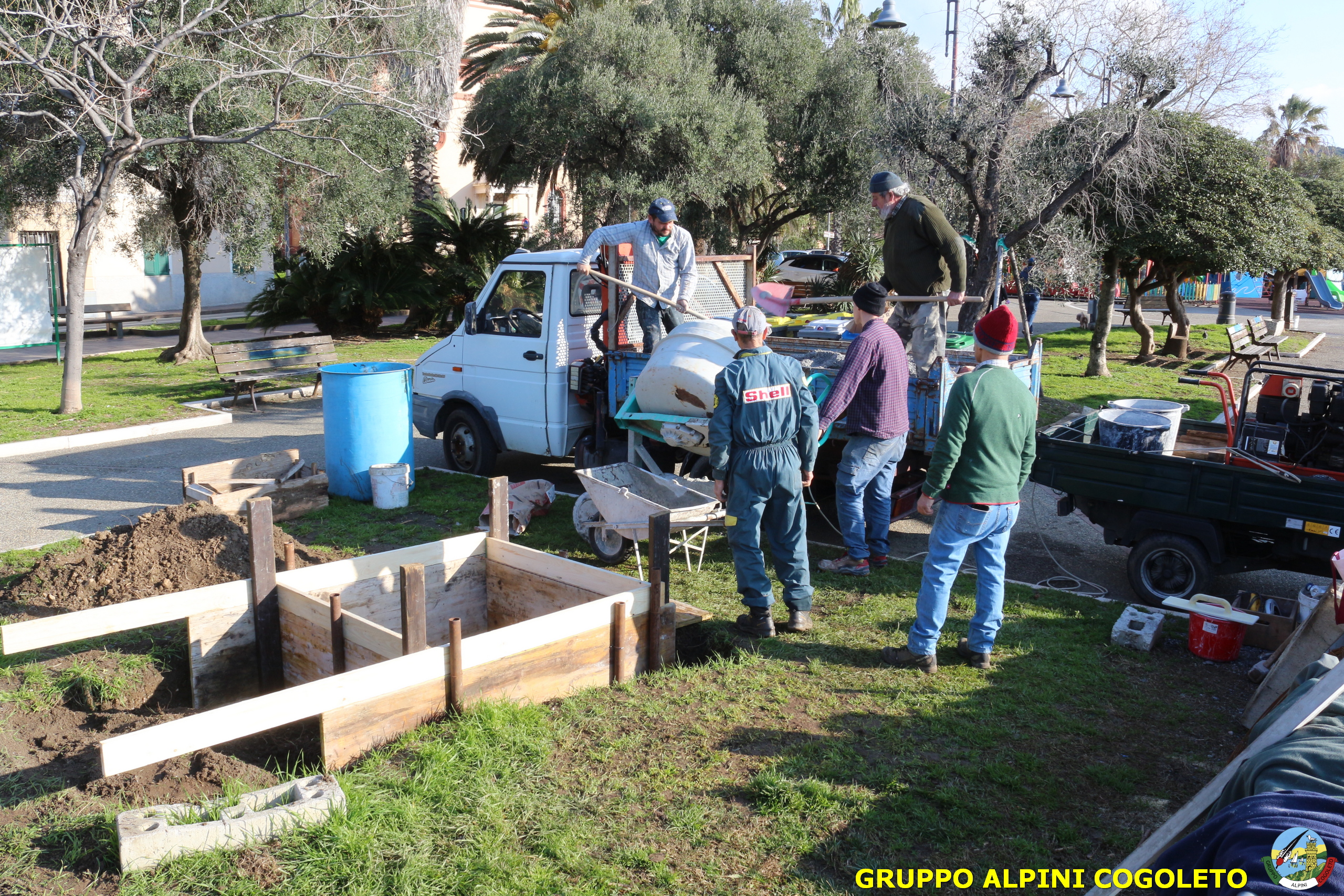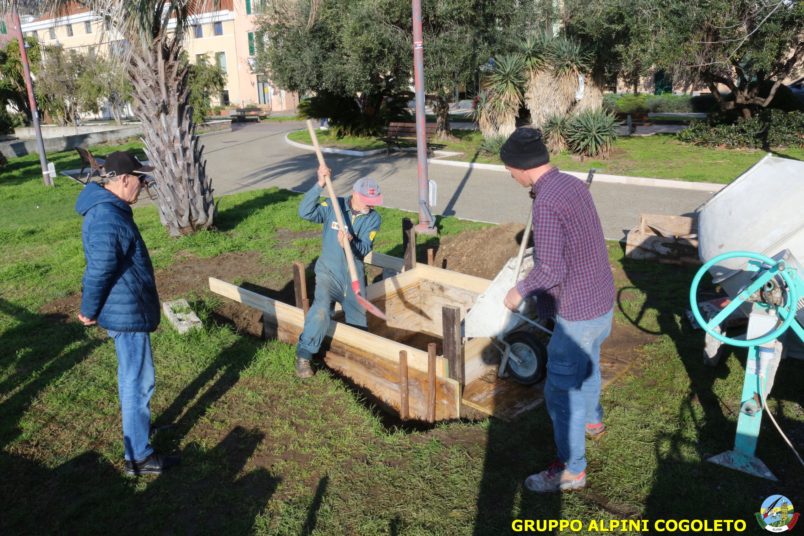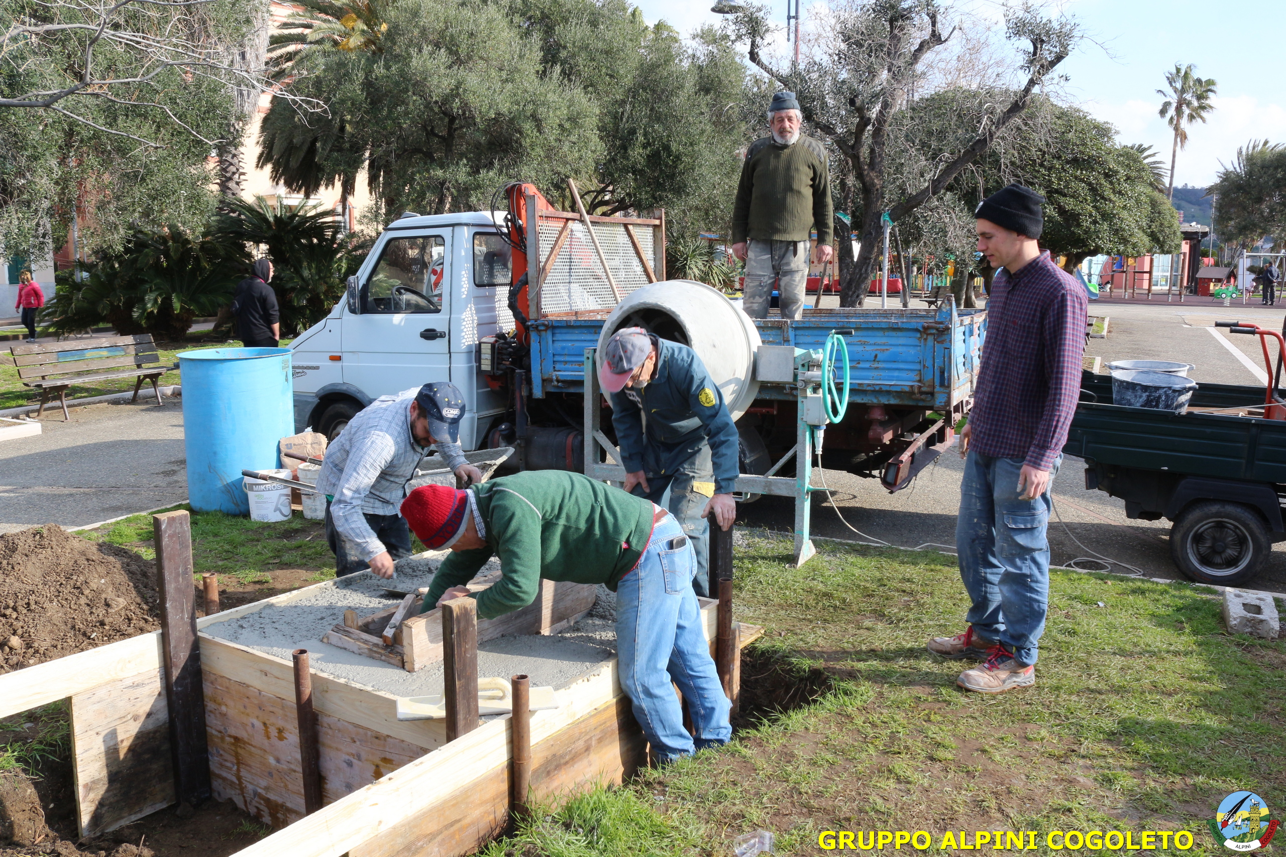 Oggi, 14 febbraio, è stata costruita la base del monumento, un modo per festeggiare San Valentino in maniera molto alternativa. Stamattina infatti appuntamento sul presto, presso lo scavo, per armare e gettare la base in calcestruzzo del monumento. Il socio aggregato Giampiero Calcagno (militare assolto nelle fila della specialità Bersaglieri) che è del mestiere, si è reso disponibile per effettuare il lavoro. Dopo aver caricato il necessario ieri sera, di buon ora è già al lavoro. Con lui i suoi operai Danilo e Paolo, coadiuvati da i nostri due Rossi (Gianni e Nicolino). In men che non si dica costruiscono cassaforma per la gettata, e dopo uno spuntino a base di focaccia si comincia ad impastare.