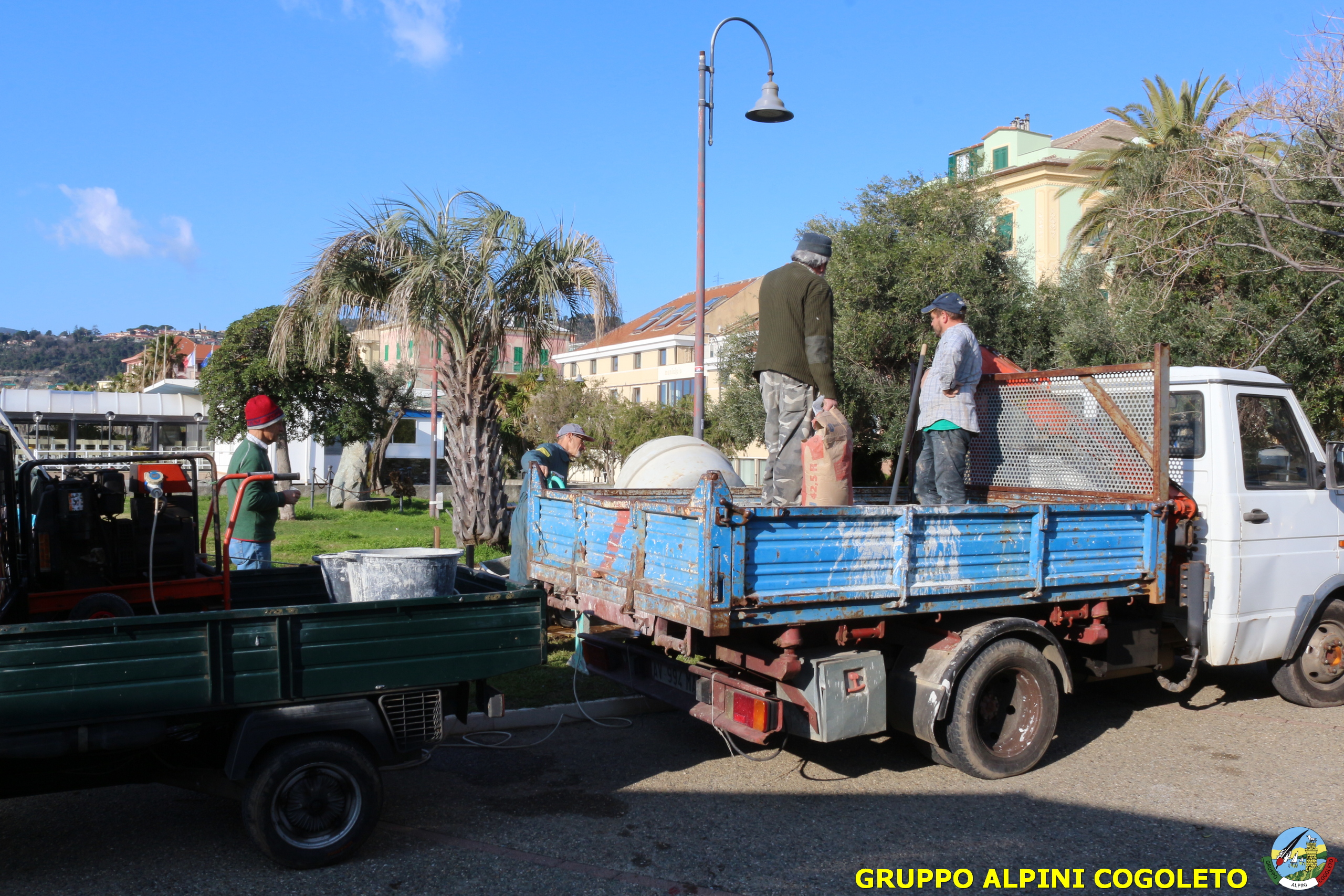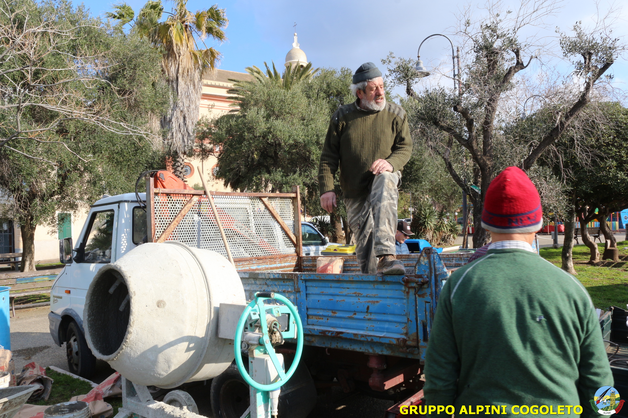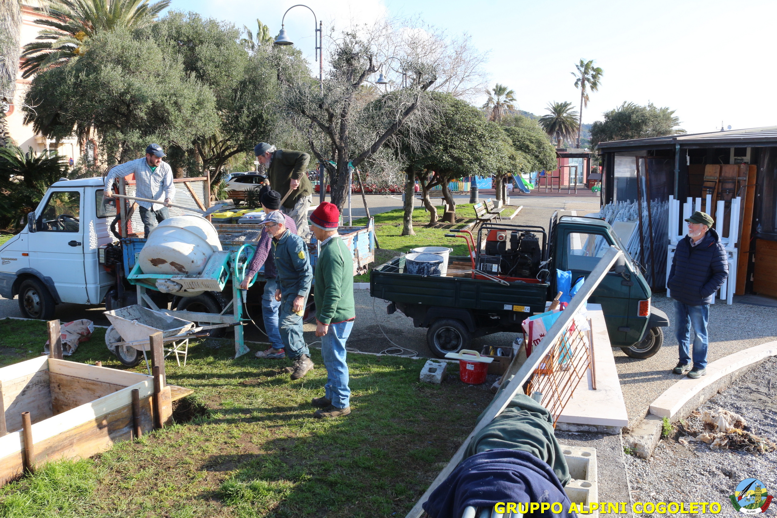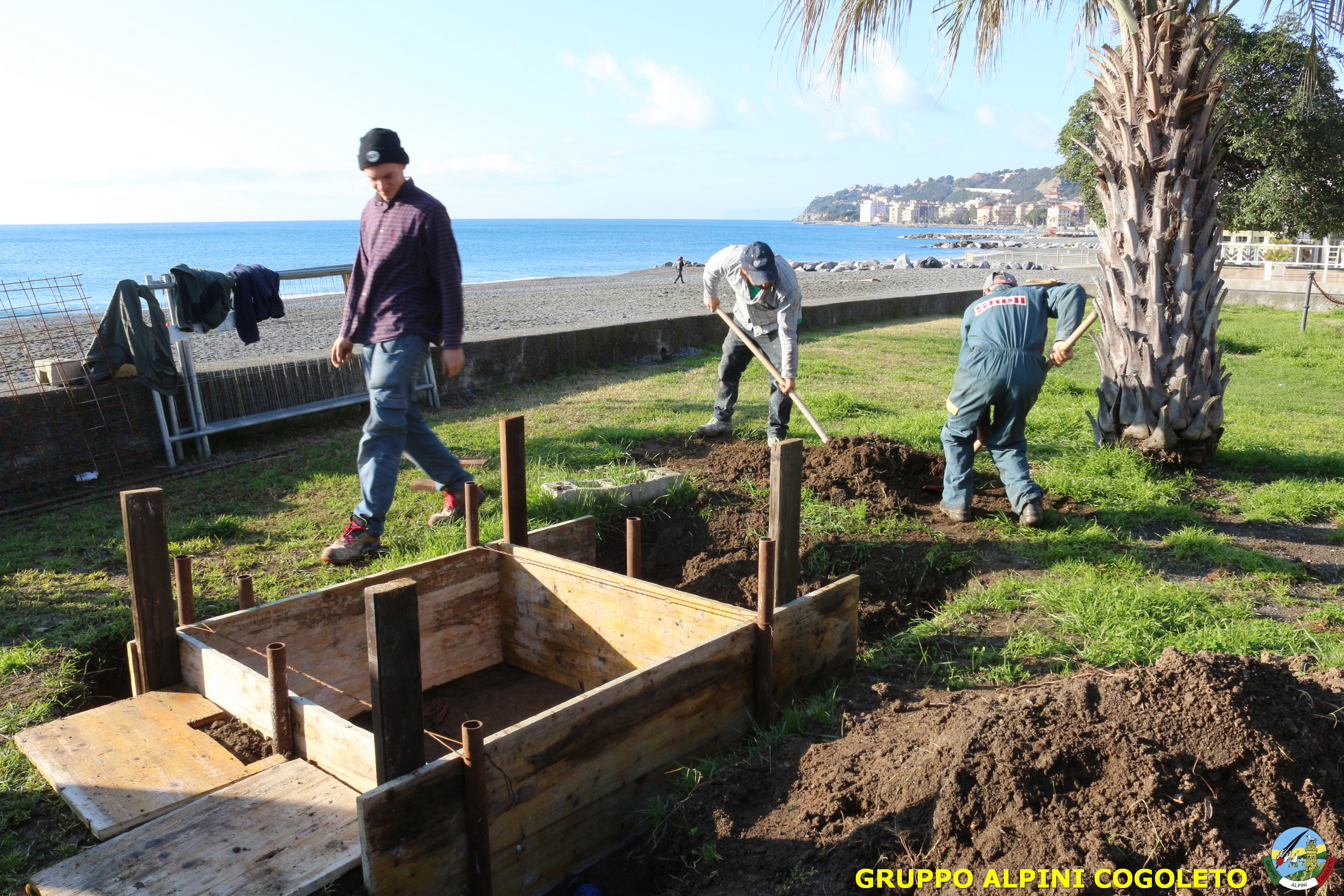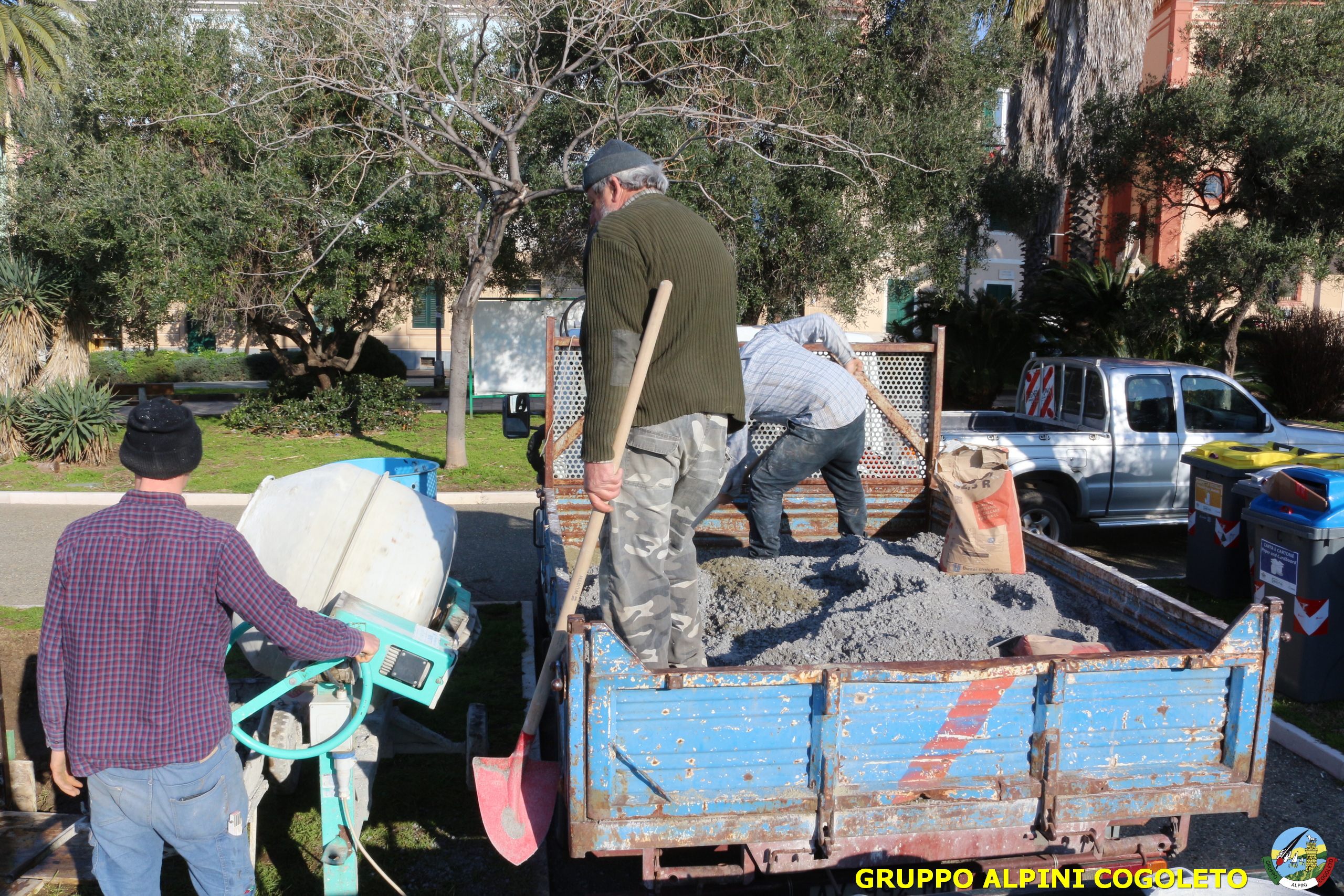 Oggi, 14 febbraio, è stata costruita la base del monumento, un modo per festeggiare San Valentino in maniera molto alternativa. Stamattina infatti appuntamento sul presto, presso lo scavo, per armare e gettare la base in calcestruzzo del monumento. Il socio aggregato Giampiero Calcagno (militare assolto nelle fila della specialità Bersaglieri) che è del mestiere, si è reso disponibile per effettuare il lavoro. Dopo aver caricato il necessario ieri sera, di buon ora è già al lavoro. Con lui i suoi operai Danilo e Paolo, coadiuvati da i nostri due Rossi (Gianni e Nicolino). In men che non si dica costruiscono cassaforma per la gettata, e dopo uno spuntino a base di focaccia si comincia ad impastare.