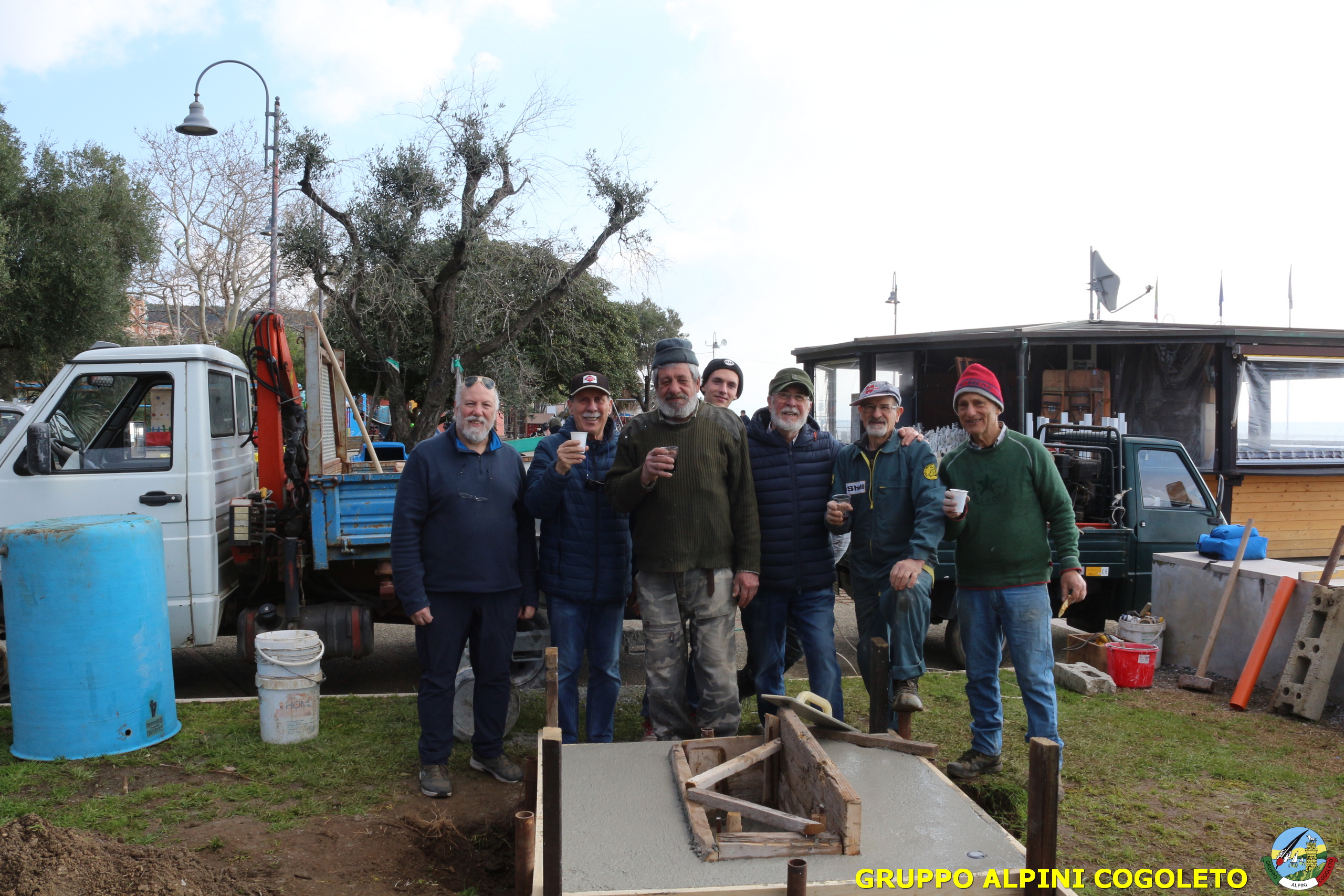 Il lavoro prosegue spedito e senza intoppi posizioniamo nella platea anche la predisposizione per l’asta della bandiera. Al centro della gettata sistemiamo una cassetta di legno opportunamente dimensionata. Sarà l’alloggiamento dove metteremo la pietra che costituisce il cuore del monumento. Alle 11.30 il lavoro è praticamente terminato, si mette via tutto il materiale avanzato e l’attrezzatura. Ma c’è tempo per un brindisi finale e per qualche foto ricordo, da pubblicare sui social o ancor meglio da tramandare a chi verrà dopo di noi. Finiamo ringraziando Giampiero che è sempre disponibile quando abbiamo bisogno, i suoi ragazzi e gli alpini del gruppo che hanno dato una mano, sia pratica che morale.