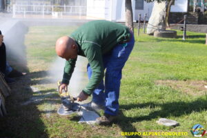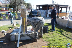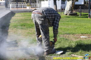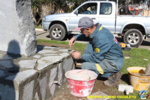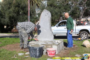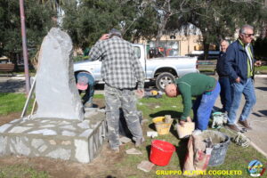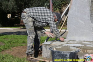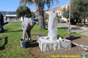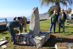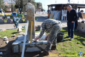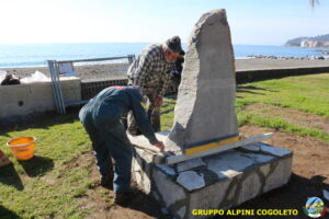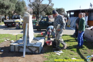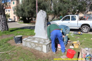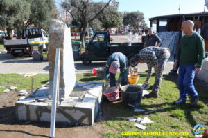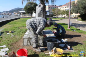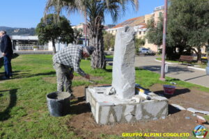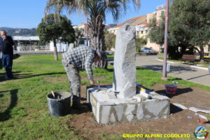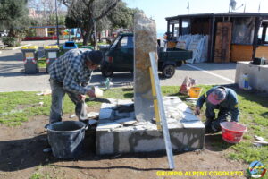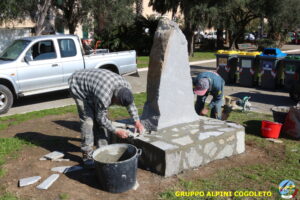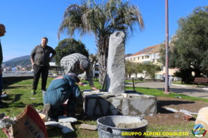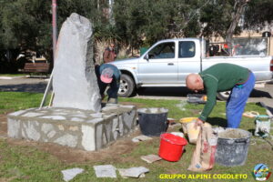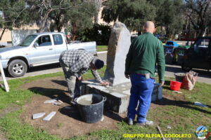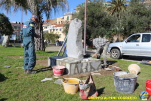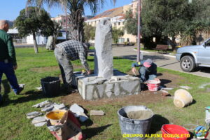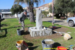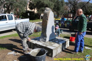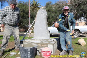 Oggi sono proseguiti i lavori del nostro monumento, con la finitura del basamento eseguita con la famosa “Pietra di Luserna”. La “Pietra di Luserna” viene estratta da cave situate nelle Prealpi Cozie del Piemonte centro-occidentale, tra la Val Pellice e la Valle Po, nei territori dei Comuni di Luserna San Giovanni, Rorà, Bagnolo Piemonte, per i quali ha sempre rappresentato un’importante risorsa economica. Il suo impiego è molto antico e caratterizza tuttora la tipologia costruttiva degli edifici e l’arredo urbano delle aree di origine e dell’intero Piemonte, dal quale, a partire dagli anni 1970, ha avuto una diffusione sia nazionale sia internazionale. È composto principalmente da feldspato (30-50%), quarzo (30-40%) e mica bianca e verdastra (10-20%), cui si deve il caratteristico colore grigio-chiaro tendente al verdognolo. I soliti noti si sono ritrovati di buon ora, e sotto le attente indicazioni di Giampiero “Talò”, il lavoro è andato avanti senza intoppi. Uniche soste il solito rito della focaccia, accompagnata da un bicchiere di vino, e un viaggio aggiuntivo a reperire un altro po’ di pietra, nel frattempo esaurita. Prima di pranzo, tutto finito e tutti a casa o al lavoro.